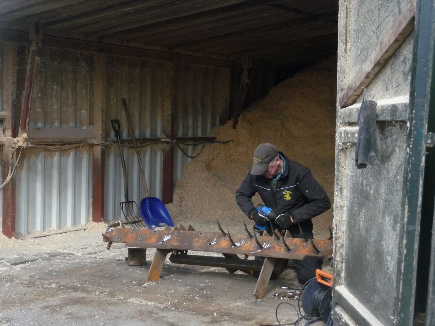 Toen ik vandaag over het plein liep zag ik , dat Hans in het half lege krullenhok bezig was met de tandjes van het sleepding , dat normaal achter aan  de ouwe blauwe vast zit. Het voermens rijdt meestal iedere dag met dat ding over de bodem van de binnenbak en soms ook van de buitenbak. Dat is om ervoor te zorgen, dat de laag zand overal op gelijke diepte blijft en dat er geen diepe hoefslagen in blijven  zitten , waar we makkelijk over kunnen struikelen. Na een aantal maanden zijn de tanden een stuk korter  geworden en ook minder scherp.  Dus dan moeten ze vervangen worden. Gelukkig kan Hans dat zelf doen . Hij zet het sleepding dan in het krullenhok als er plek genoeg is . Het voordeel van die plek is , dat hij niet nat wordt als het regent  en ook niet in de wind zit. Het is namelijk iedere keer weer een behoorlijke klus, die niet een , twee , drie klaar is . Maar ook dit keer  is het weer gelukt en ik zag de ouwe blauwe net weer voorbij komen  rijden met mooi lange tanden, die weer een poos mee zullen gaan.